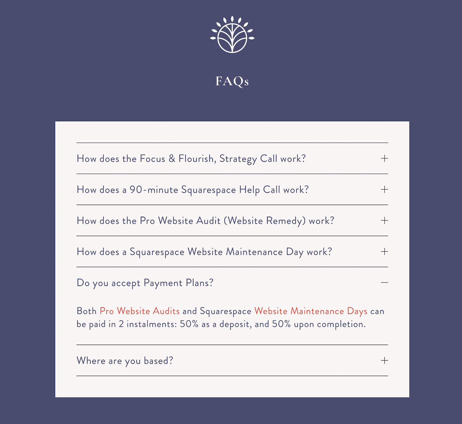 Add an FAQ accordion so potential clients feel confident about taking the next step.