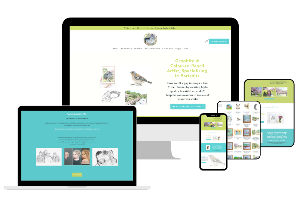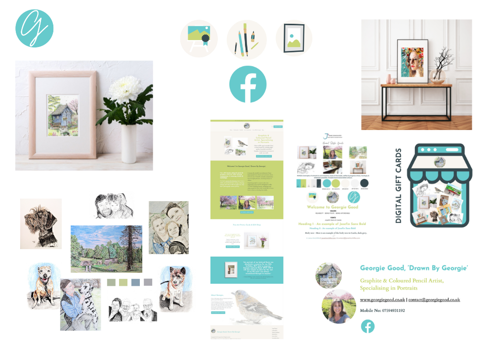Georgie needed to update a new website in order to move her already successful business to the next level. She also hired me to create various brand assets including a favicon, Facebook icon, icons representing services, graphics for her art shop, artwork mockups, collages, email signature, and a brand style guide. Accessibility integration. Lastly, the design of business cards and A5 leaflets.